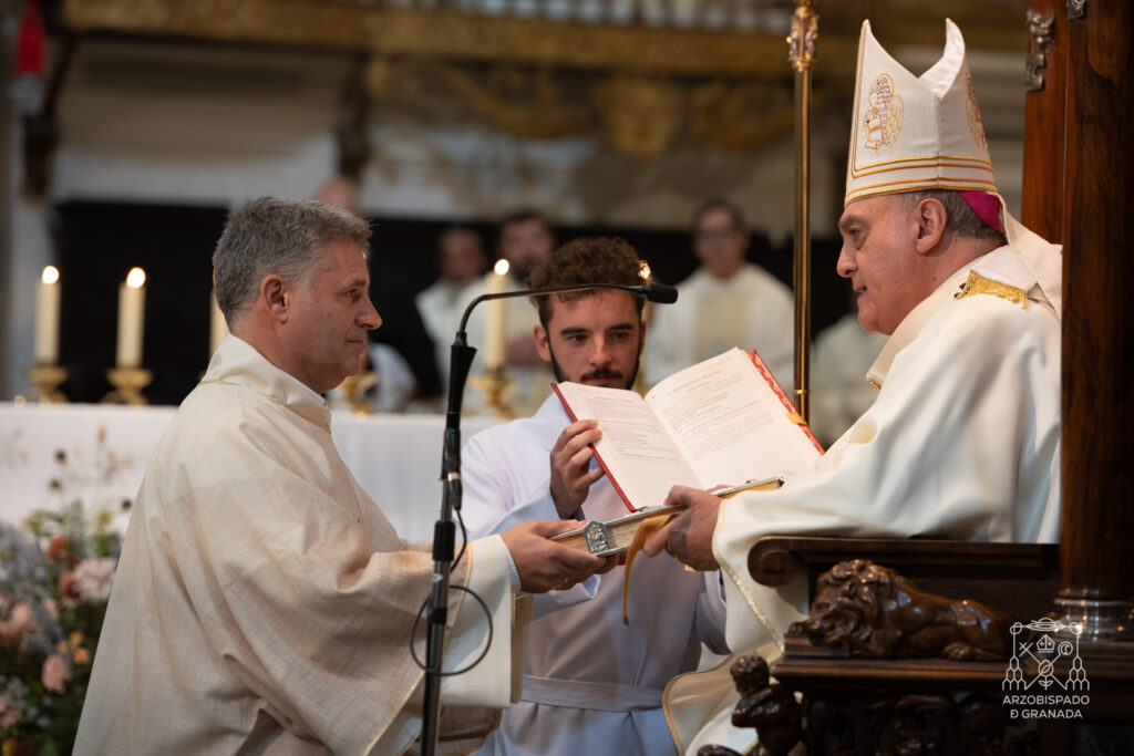 El nuevo presbítero fue revestido con los ornamentos sacerdotales, antes de incorporarse al altar junto al presbiterio, ayudado por el Vicario General, D. Enrique Rico Pavés, que fue rector del Seminario Mayor San Cecilio durante la etapa formativa como seminarista.