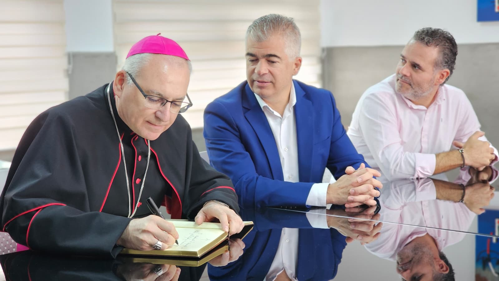 A continuación, el Pastor diocesano visitó el Ayuntamiento, donde fue recibido por el alcalde, D. Emilio Torres, junto a miembros de la Corporación Municipal. Tras una cálida y afectuosa bienvenida por parte del alcalde y unas palabras de Don Sebastián en las dependencias municipales, pasó a firmar en el libro de honor del Ayuntamiento y saludó a los funcionarios. Durante su visita recibió el pin-insignia institucional del Ayuntamiento.