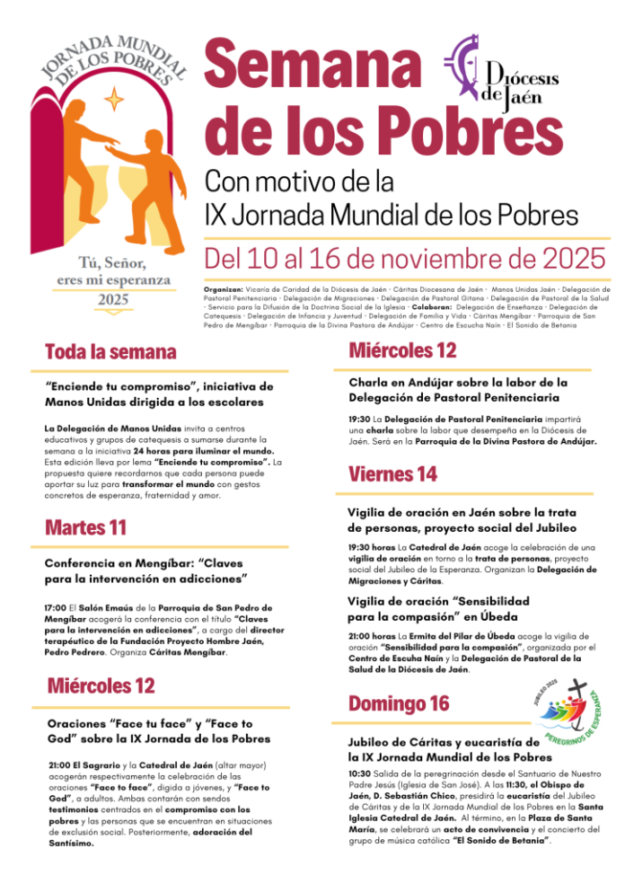 Finalmente, el domingo 16, IX Jornada Mundial de los Pobres, se celebrará el Jubileo de Cáritas. La cita comenzará a las 10:30 horas en el Santuario de Nuestro Padre Jesús. Desde allí partirá la peregrinación hasta la Catedral de Jaén, donde, a las 11:30 horas, comenzará la eucaristía presidida por el Obispo de Jaén, Don Sebastián Chico. Al término, se ha programado un acto de convivencia en la Plaza de Santa María, en el que protagonizará un concierto el grupo de música católica El Sonido de Betania.