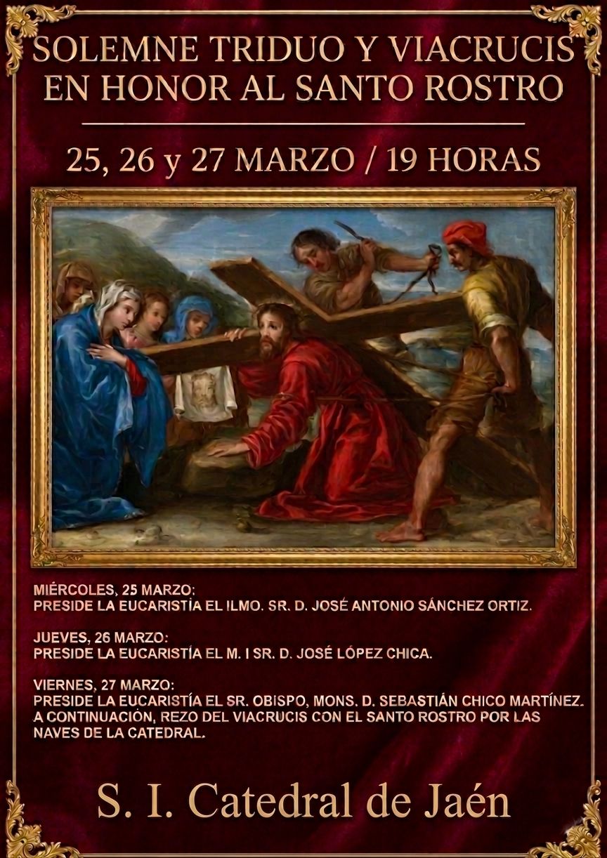 Al finalizar la Eucaristía y el ejercicio del triduo, este Viernes de Dolores, como es tradicional, se realizará el piadoso ejercicio del Vía Crucis con el Santo Rostro por las naves de la seo jiennense.