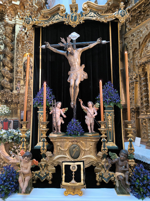 El actual misterio, procedente de Murcia (1777), es obra conjunta de Francisco Salzillo y Nicolás Salzillo. La Hermandad se completa con la Virgen de la Caridad, realizada en 2003 por José Antonio Cabello Montilla, acompañada por un San Juan Evangelista obra de Francisco Romero Zafra (2010), imágenes que expresan la continuidad de la devoción en el siglo XXI.