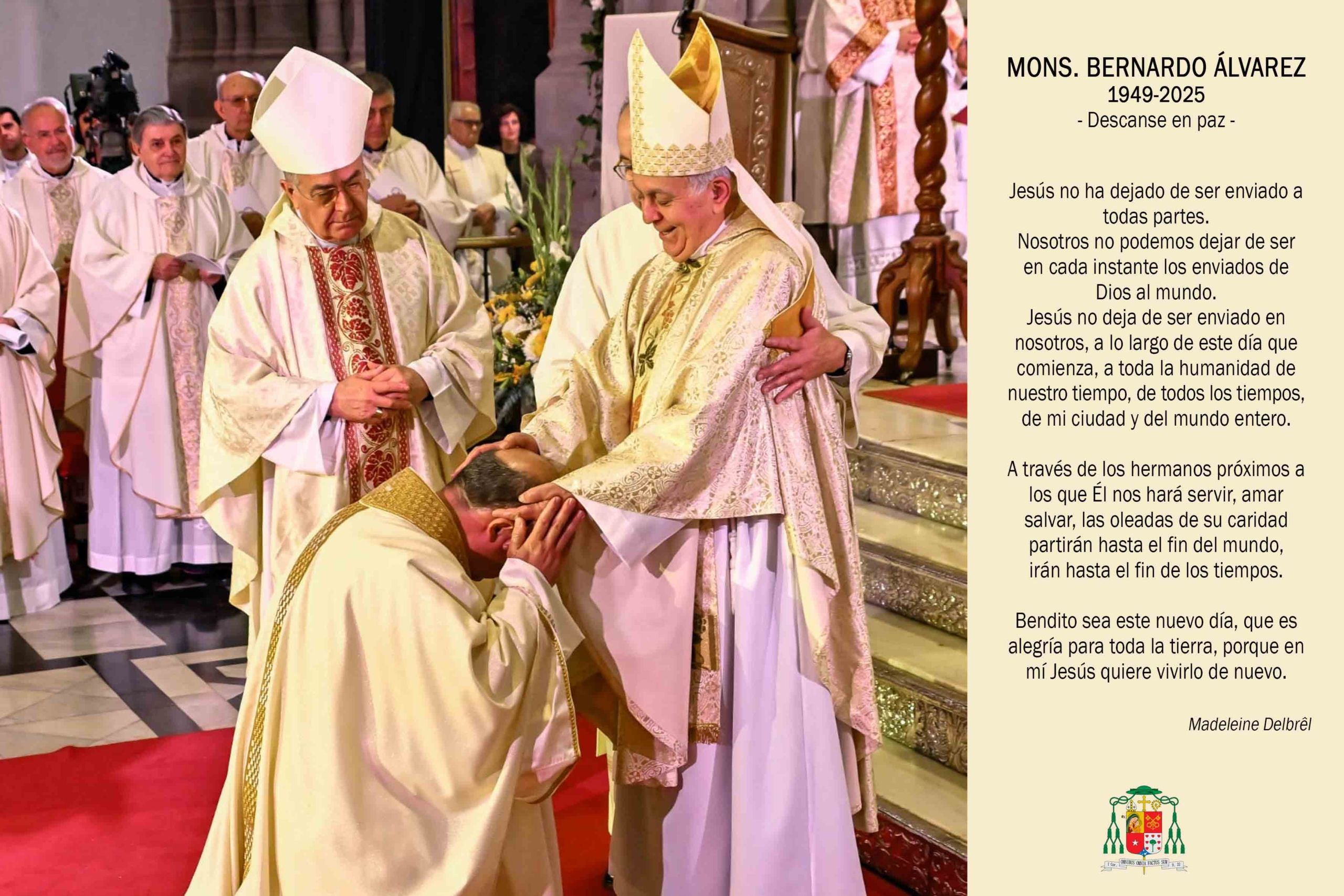D. Bernardo presidió en la Catedral la misa de acción de gracias por su episcopado. En su homilía, Álvarez agradeció a Dios por la fe y su ministerio y finalizó con una simpática referencia y pidiendo perdón por sus errores. “Yo suelo decir, a veces, que D. Felipe y D. Damián están en el purgatorio porque me propusieron a mí como obispo. También quiero pedir perdón por si alguna vez me he equivocado, o no he acertado a decir las cosas como corresponden. Asimismo, pedir perdón al Señor y a ustedes porque algunas veces he fallado y no he respondido a lo que Él pide”.