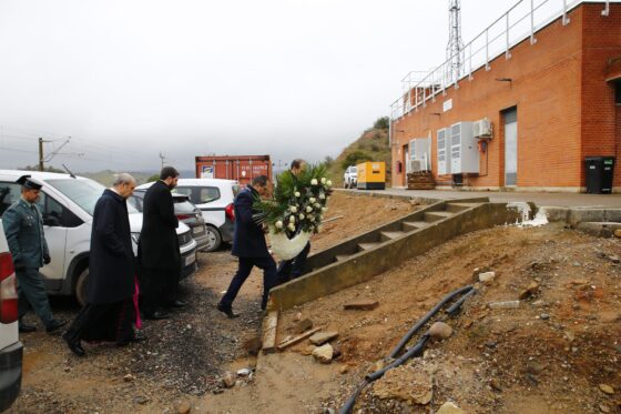 Tras la celebración eucarística, el Obispo y el alcalde de Adamuz, Rafael Ángel Moreno, han depositado una corona en la zona cero del accidente junto al párroco y una representación de la Guardia Civil.