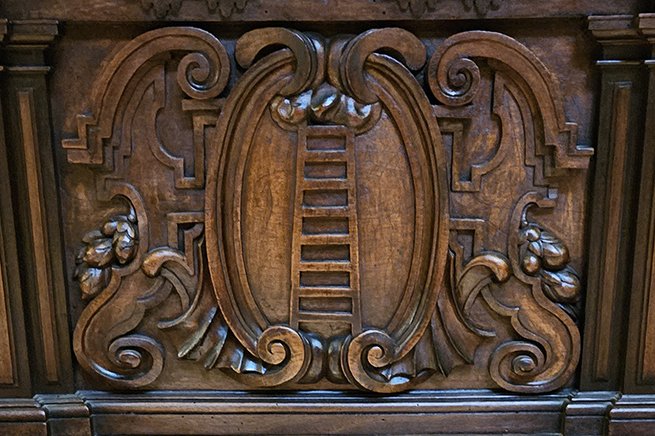 Al nivel de la tabla correspondiente a la imagen de san Francisco de Asís, podemos contemplar la representación casi esquemática de una escalera cuyo extremo superior se pierde en un cúmulo de nubes. Es un signo ascensional empleado figuradamente en las Sagradas Escrituras, caso del pasaje del patriarca Jacob cuando, tras escapar de la furia de su irascible hermano Esaú, se quedó dormido sobre una piedra del monte Moriah y tuvo en sueño por el que contempló una escala, conducto entre la gloria y la tierra, por donde los ángeles escalaban y descendían, (Génesis, 28, 11-19); de manera similar a como anunció san Juan en su evangelio: (1,51) «Veréis el Cielo abierto y a los ángeles de Dios subir y bajar sobre el Hijo del Hombre».