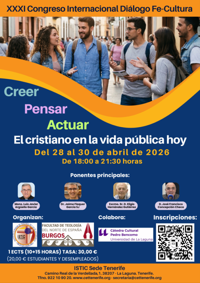Desde el 28 al 30 de abril, tendrá lugar el XXXI Congreso Internacional Diálogo Fe-Cultura organizado por el Instituto de Teología de las Islas Canarias y la Facultad de Teología del Norte de España. Asimismo, las jornadas contarán con la colaboración de la Cátedra Cultural Pedro Bencomo.