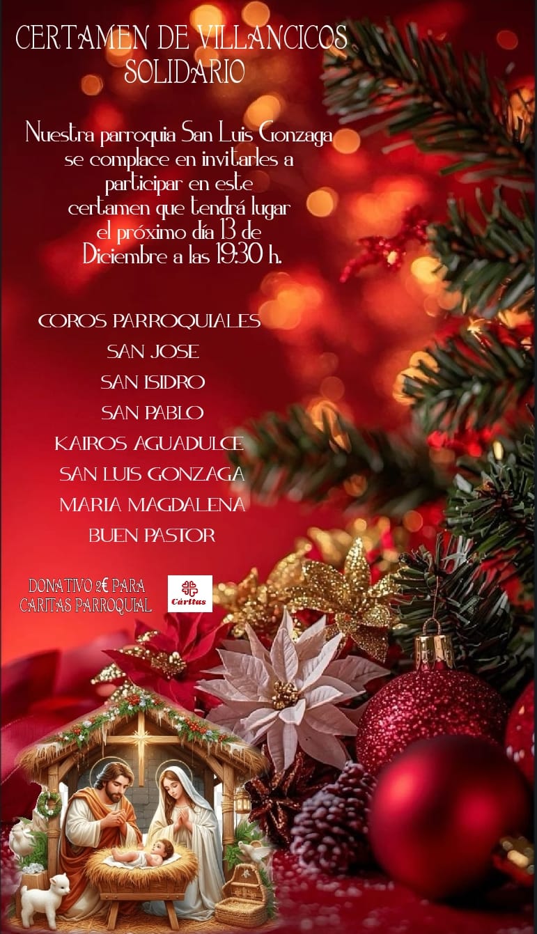 El próximo sábado 13 de diciembre, a las 19.30 horas, tendrá lugar un Certamen de Villancicos Solidario en la parroquia de San Luis Gonzaga, que actuará como parroquia anfitriona de este encuentro navideño.