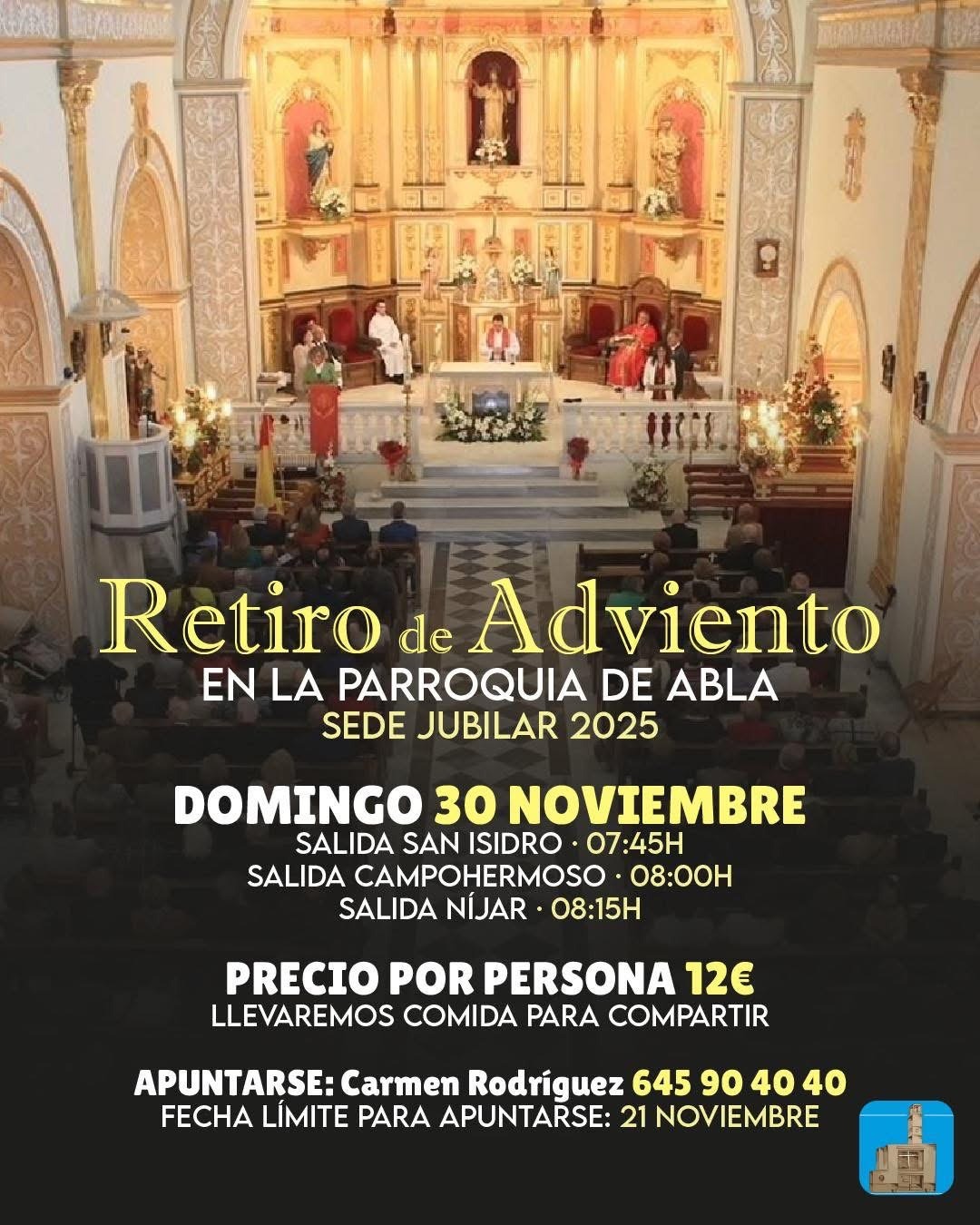 Las parroquias de San Isidro, Campohermoso y Níjar vivirán el próximo domingo 30 de noviembre una jornada de comunión y preparación espiritual con motivo del Retiro de Adviento, que este año tendrá lugar en la Parroquia de Abla, designada Sede Jubilar 2025.