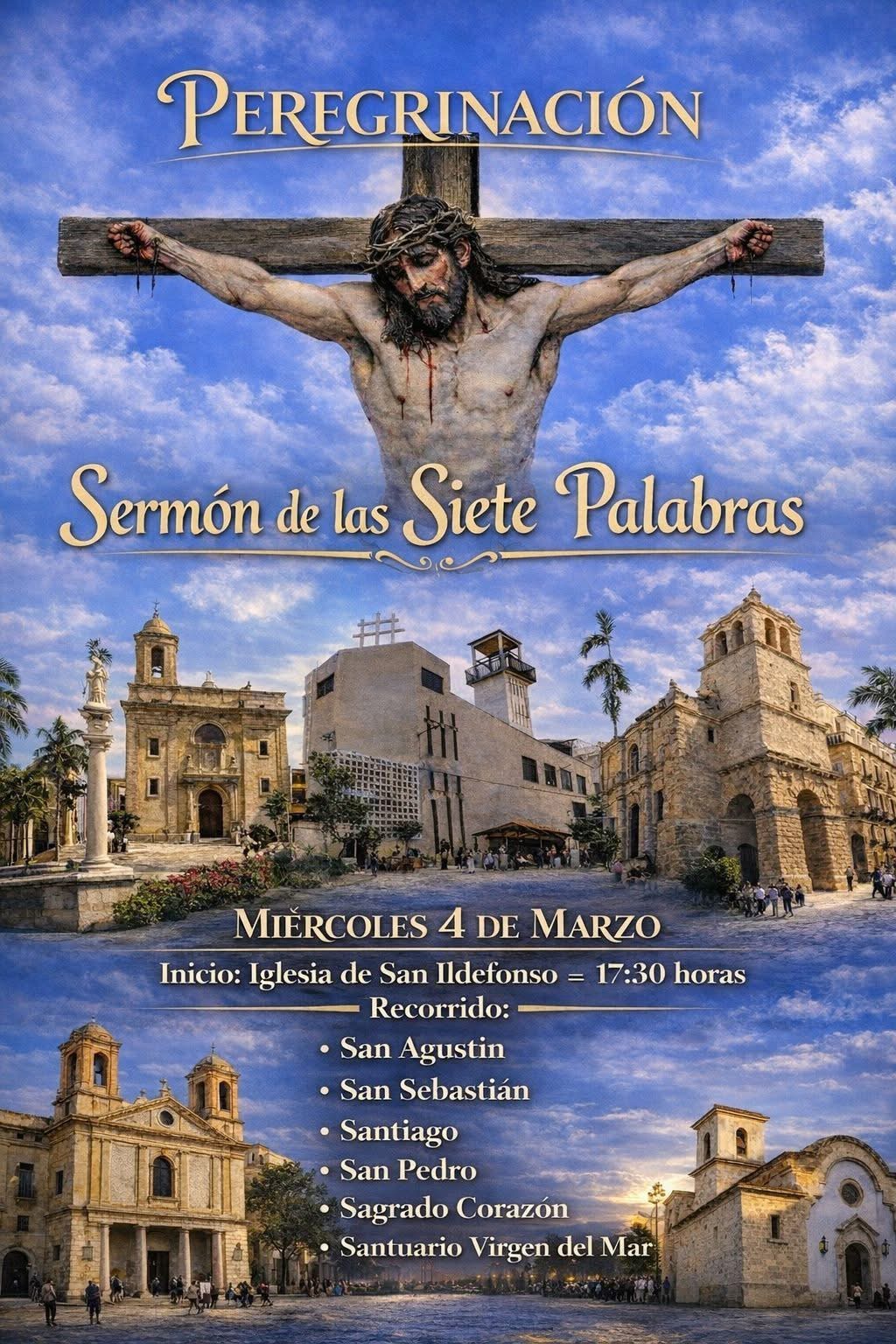 La peregrinación dará comienzo a las 17:30 horas en la Iglesia de San Ildefonso. Desde allí, los participantes recorrerán diversos templos del centro de la ciudad: San Agustín, San Sebastián, Santiago, San Pedro y el Sagrado Corazón, para culminar en el Santuario de la Virgen del Mar.