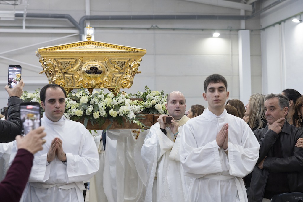 7. Los restos del nuevo Beato son dispuestos en un lugar destacado del altar, mientras los sacerdotes se preparan para repartir la comunión