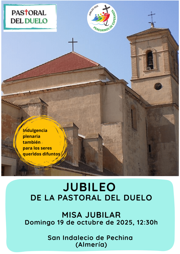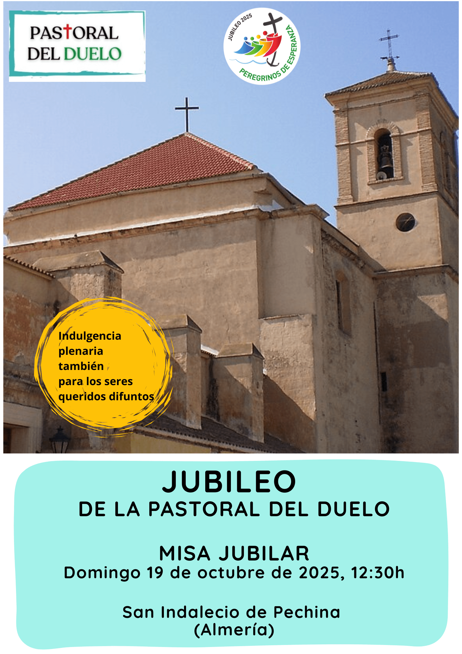 En la diócesis de Almería, la Misa Jubilar se celebrará el domingo 19 de octubre, a las 12:30 h, en la parroquia de San Indalecio de Pechina, presidida por su nuevo párroco, D. Alejandro Moreno. Están invitados a participar no solo los miembros de los grupos parroquiales de ayuda en duelo “Resurrección”, sino también todas las personas de la diócesis que deseen obtener la Indulgencia Plenaria por sus seres queridos difuntos o para sí mismas.