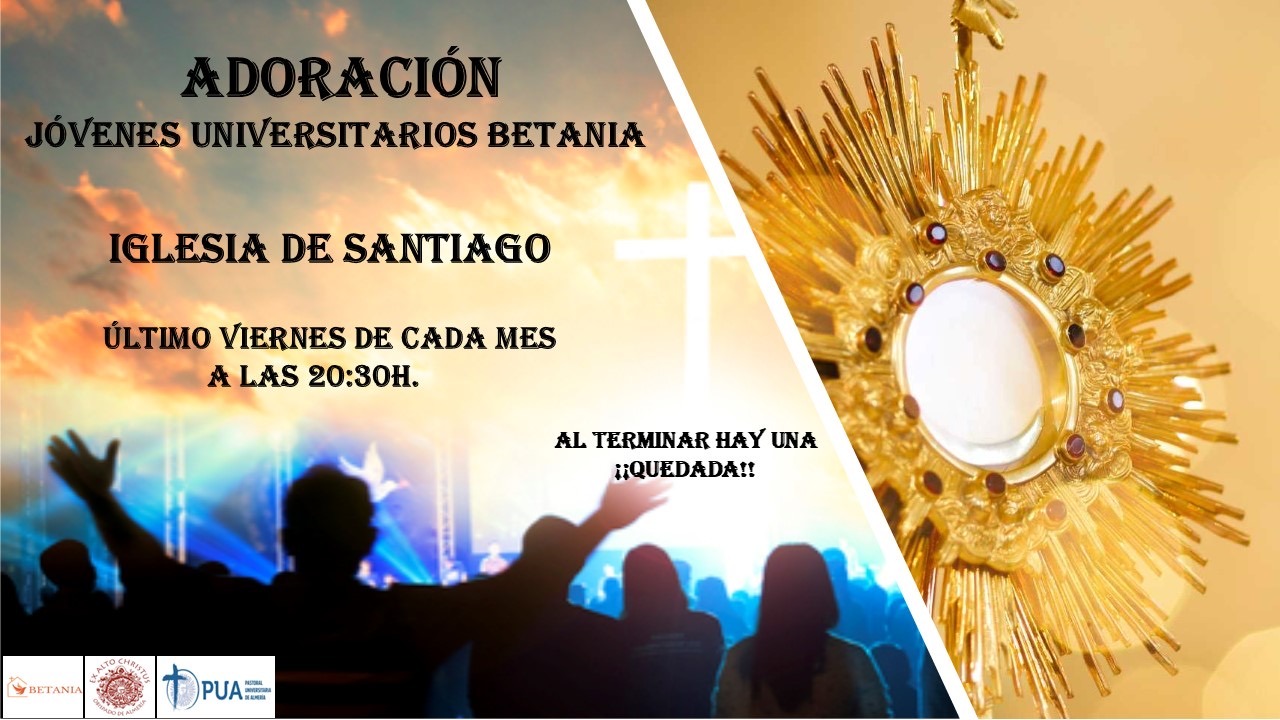Por su parte, el grupo Betania invita a los jóvenes a un encuentro de adoración eucarística el último viernes de cada mes, a las 20:30 h, también en la Iglesia de Santiago. A continuación, se ofrece la Lectio Divina, un tiempo de oración serena con la Palabra de Dios, especialmente pensada para la comunidad universitaria. Tras este momento de estudio biblico tendrá lugar una quedada fraterna como ocasión para compartir, conocerse y fortalecer la amistad en un ambiente cristiano.