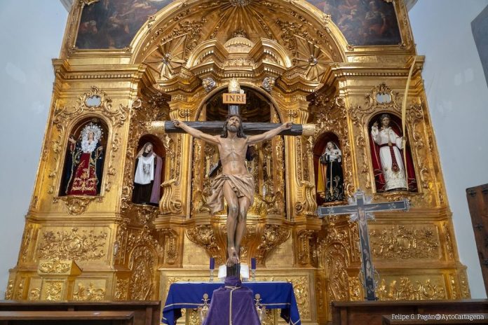 Presidiendo el presbiterio se situará la imagen del Santísimo Cristo de la Agonía, una talla de autor anónimo fechable entre los siglos XVII y XVIII. Esta venerada imagen se conserva en la Basílica de la Santísima Virgen de la Caridad de Cartagena, perteneciente al Santo y Real Hospital de la Caridad, institución histórica de profunda raigambre asistencial y cristiana.