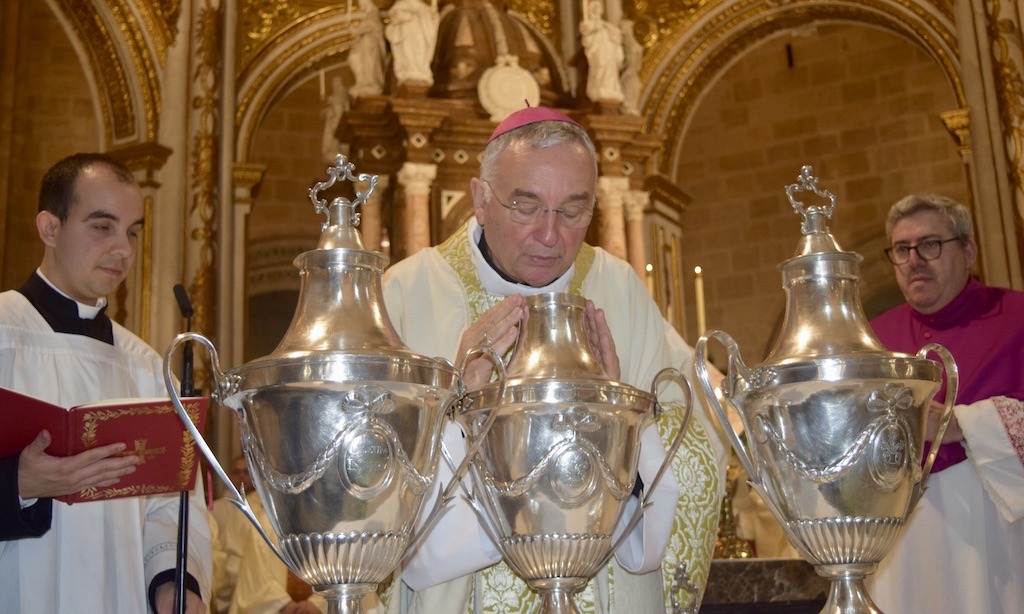 Tras la homilía, los sacerdotes renovaron sus promesas sacerdotales ante el obispo y la comunidad reunida. Antes del rezo del Padrenuestro se bendijo el óleo de los enfermos; después de la comunión, el de los catecúmenos; y finalmente el santo crisma, al que se añadió perfume antes de su consagración, signo de la plenitud del Espíritu.
