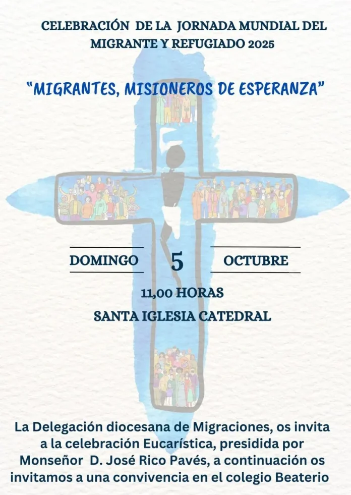 El próximo sábado 5 de octubre a las 11hrs, la Santa Iglesia Catedral acogerá la celebración de la Santa Misa con motivo de la Jornada Mundial del Migrante y Refugiado, organizada por la Delegación Diocesana de Migraciones de Asidonia-Jerez.
