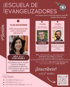 Así, la primera invitada a la Escuela de Evangelizadores será el Dña. Eva Fernández, presidenta de la Acción Católica General, que hablará sobre ACG, un proyecto de vida y renovación parroquial. Será el próximo 15 de noviembre cuando se inaugurarán las Escuelas. Para inscribirse es necesario rellenar este formulario: INSCRIPCIONES