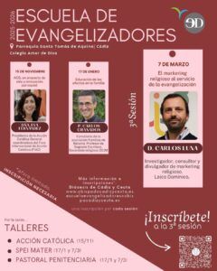 La presente edición de la Escuela de Evangelizadores comenzó el pasado 15 de noviembre de 2025 y ha contado con tres sesiones formativas. A lo largo del curso se han tratado cuestiones como “La Acción Católica General, un proyecto de vida y renovación parroquial”, centrada en el compromiso laical en la vida de la Iglesia; “La educación de los afectos de la familia”, dedicada al acompañamiento y formación en el ámbito familiar; y esta última sesión, enfocada en el marketing religioso como herramienta pastoral.