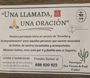La Parroquia de San Vicente de Paúl ha puesto en marcha un nuevo servicio de acompañamiento telefónico dirigido a personas que atraviesan situaciones de enfermedad, sufrimiento o soledad. La iniciativa, impulsada a través de la Pastoral de la Salud de la Diócesis de Cádiz y Ceuta, ha comenzado a funcionar este lunes, 9 de marzo, bajo el lema “Una llamada, una oración”.