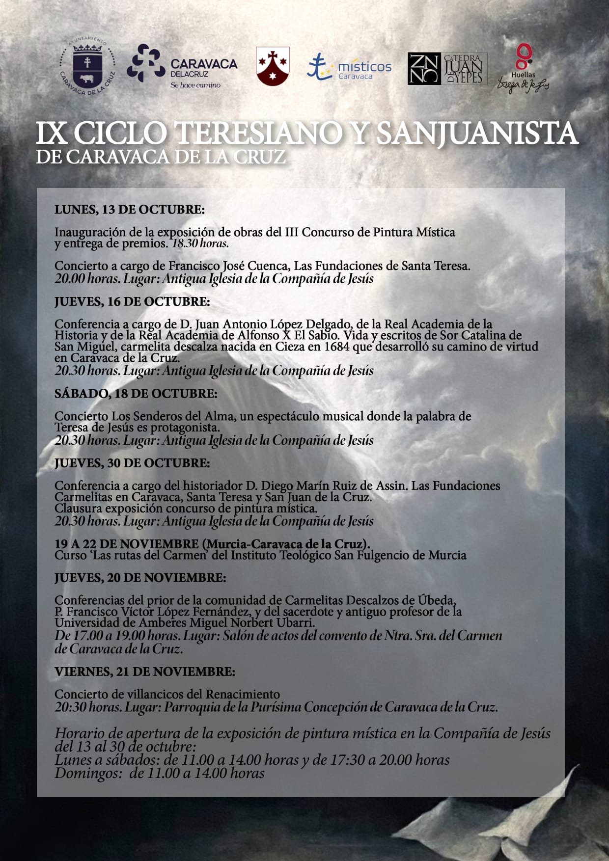 El secretario del Instituto Teológico San Fulgencio y de la Cátedra Juan de Yepes y miembro de la Asociación Místicos, Javier Marín, ha presentado las actividades que darán comienzo el lunes 13 de octubre con la inauguración de la exposición de las obras presentadas al III Concurso de Pintura Mística, en la antigua iglesia de la Compañía de Jesús, a las 18:30 horas, momento en el que se entregarán los premios del concurso. Después, a las 20:00 horas, tendrá lugar el concierto Las fundaciones de santa Teresa, a cargo de Francisco José Cuenca. La exposición permanecerá abierta hasta el 30 de octubre con horario de lunes a sábado de 11:00 a 14:00 horas y de 17:30 a 20:00 horas; y los domingos de 11:00 a 14:00 horas.
