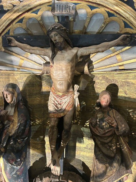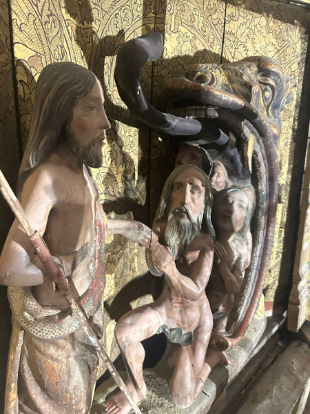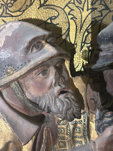 En el retablo, hay 18 hornacinas cuadradas con relieves en su mayoría, aunque otras albergan esculturas exentas de una calidad algo inferior.