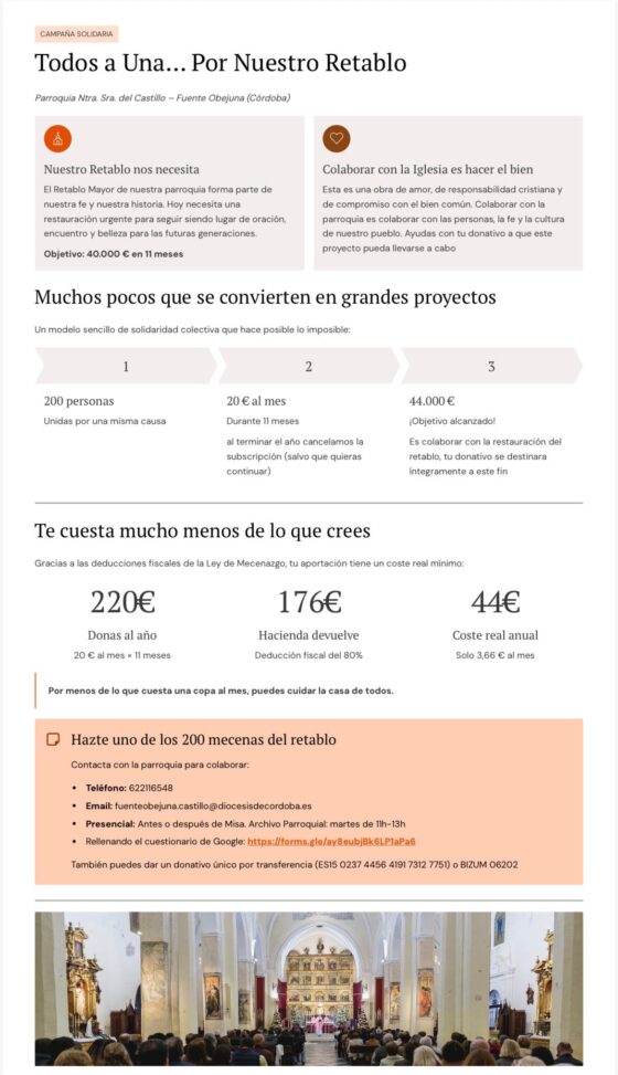 Según han informado desde la parroquia, el coste total de la intervención asciende a 69.096 euros, de los que la Diputación de Córdoba aportará 28.785 euros procedentes de una subvención de la convocatoria de salvaguarda del patrimonio y los castillos. «Esto significa que, en los próximos dos años, tendremos que conseguir la cantidad de 44.212 euros para poder completar estos proyectos tan necesarios y tan ilusionantes para nuestro pueblo», ha explicado el párroco, Pedro Jesús Pino.