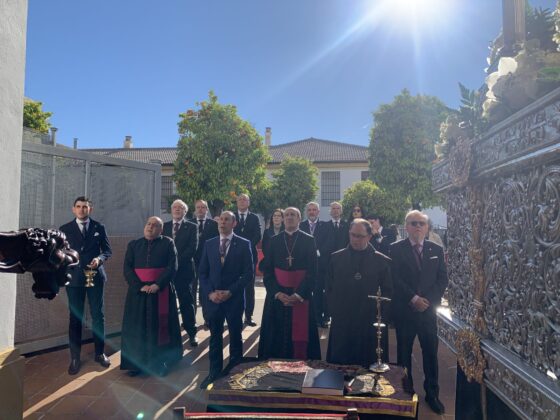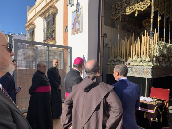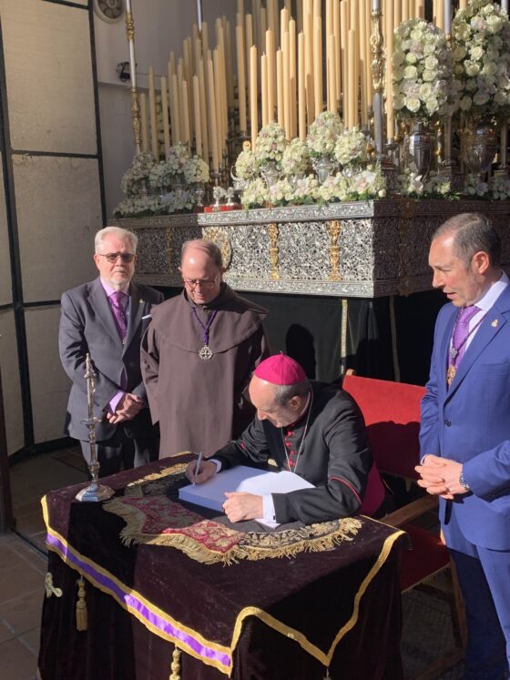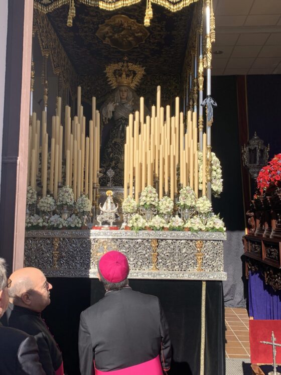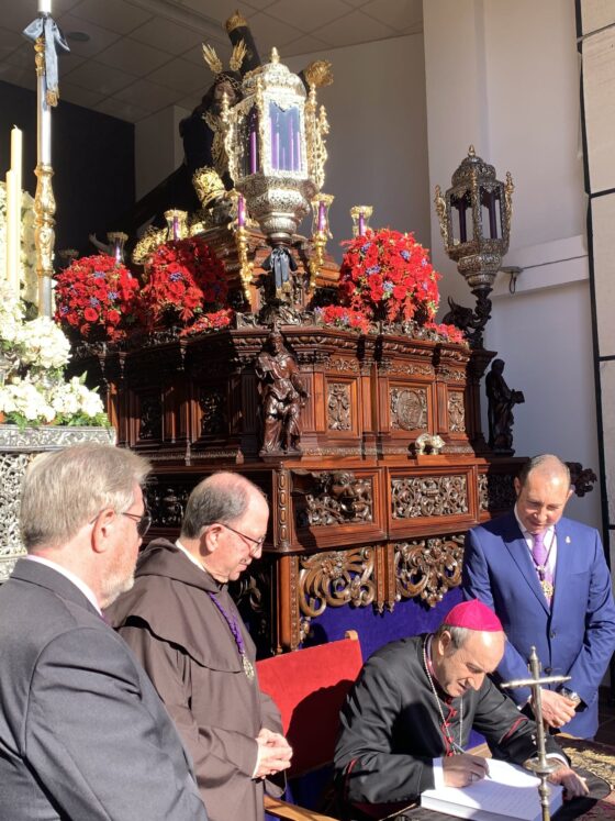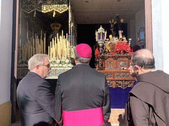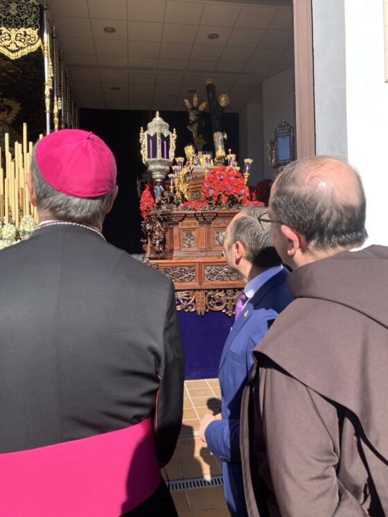 El Delegado de hermandades y cofradías, José Juan Jiménez Güeto, y el consiliario, Juan José Romero Coleto, han acompañado al prelado a conocer a Nuestro Padre Jesús Caído a su sede donde todo está preparado para su estación de penitencia. El hermano mayor, Ángel Cano, el consiliario, el Padre Fray Francisco Javier Jaén, y miembros de la hermandad. Las puertas del templo se abrieron a primera hora de la mañana para recibir a los hermanos y devotos que quieran visitarlos antes de su salida procesional.