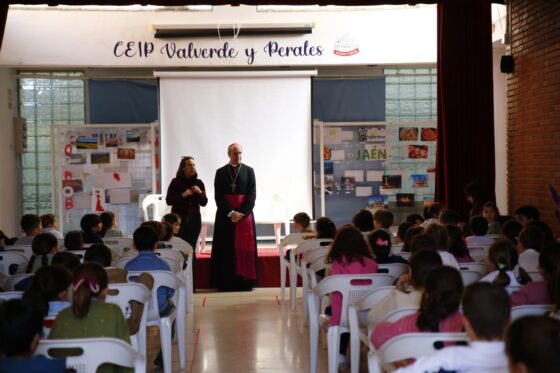 Tras una reunión con la Alcaldesa y concejales, el prelado se dispuso a visitar el colegio de infantil y primaria Valverde y Perales. Allí mantuvo un encuentro con los alumnos de Primaria. Después, visitó el colegio Santa María de Albendín, en el cual los niños representaron un teatro de la Semana Santa, la procesión de Palmas, el lavatorio de pies, así como la Pasión, Muerte y Resurrección del Señor.