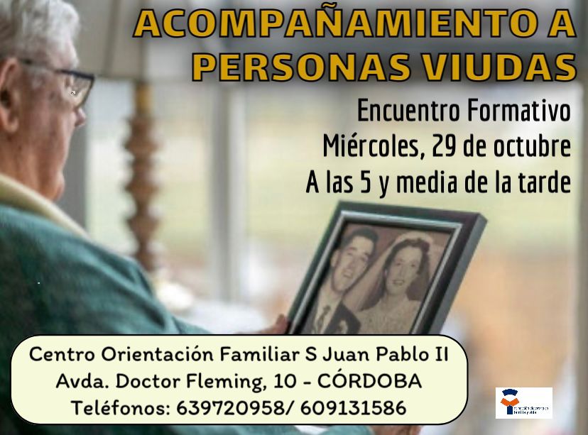 La Delegación Diocesana de Familia y Vida de la Diócesis de Córdoba continúa con su compromiso de acompañar a las personas viudas en su camino de fe y esperanza y vuelve a poner en marcha un nuevo encuentro formativo el miércoles, 29 de octubre, a las 17:30 horas, en el Centro de Orientación Familiar “San Juan Pablo II” de Córdoba (Avda. Doctor Fleming, 10).