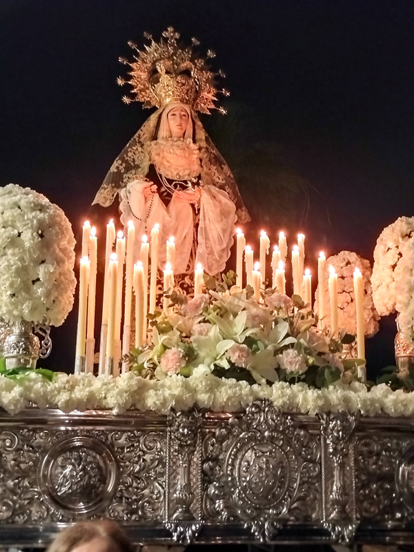 Carmen, con gran determinación, comenzó a pedir donativos puerta a puerta y logró reunir a un grupo de mujeres que la acompañaron en la confección de mantos y vestiduras. Durante las noches, Carmen cosía con dedicación, mientras que durante el día, el grupo se unía para continuar la labor. Poco a poco, transformaron el aspecto de las imágenes y lograron adquirir pasos procesionales para la Virgen y Jesús Nazareno, así como una caja de cristal para el Santo Entierro.