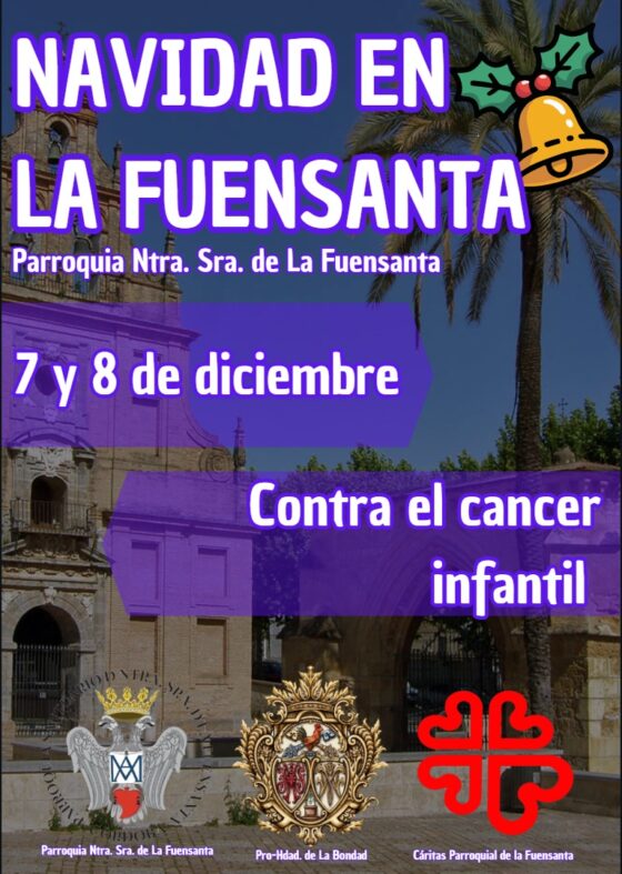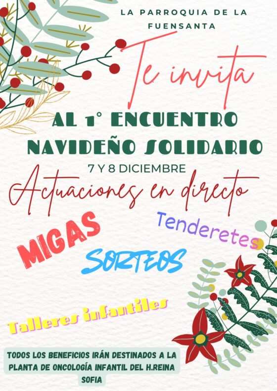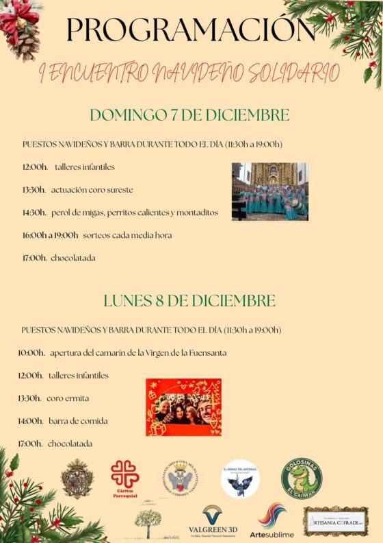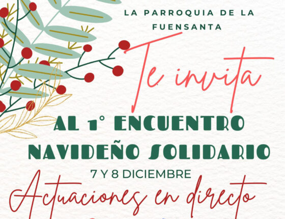La parroquia Ntra. Sra. de la Fuensanta, Cáritas parroquial y la Pro-Hdad. De la Bondad están organizando el primer encuentro navideño solidario. Esta convivencia familiar estará cargada de actividades para todas las edades, talleres infantiles, puestos de artesanía navideña, mercadillos de segunda mano, sorteos, actuaciones en directo y servicio de barra. Tanto los puestos navideños como la barra estarán para comer estarán abiertos los dos días, de 11:30 a 19:00 horas.