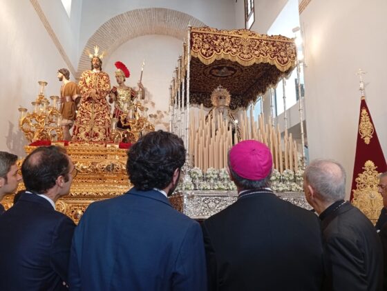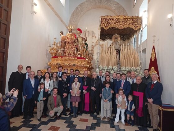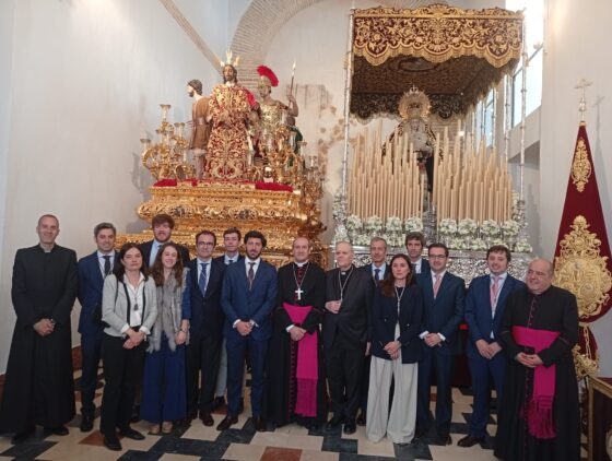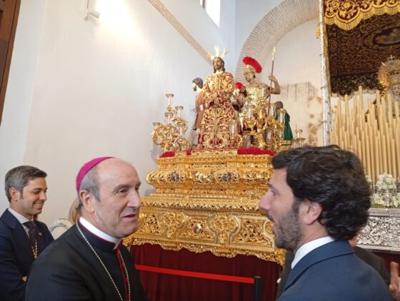 La imagen del Señor de la Sentencia de Juan Martínez Cerrillo junto a la Virgen de Gracia y Amparo será la cuarta en salir en la tarde del Lunes Santo por las calles de Córdoba. Lo hará desde su nueva casa de hermandad, en la que el obispo de Córdoba, monseñor Jesús Fernández, ha estado horas antes de su salida procesional para conocer a los miembros de la Junta de Gobierno e impartir su bendición.