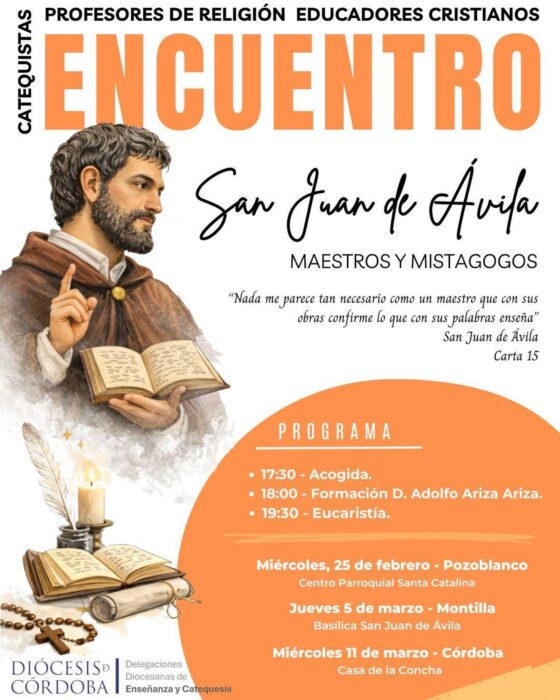 Las Delegaciones de Enseñanza y Catequesis de la Diócesis pondrán en marcha este año tres nuevos encuentros para educadores cristianos. El primero tendrá lugar en el centro parroquial de Santa Catalina de Pozoblanco el miércoles 25 de febrero; en la Basílica de San Juan de Ávila en Montilla se celebrará el segundo el jueves 5 de marzo; y el miércoles 11 de marzo en la Casa de la Concha.