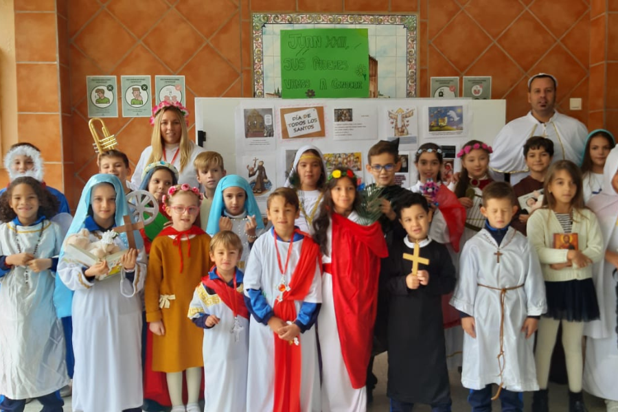 Como actividad de investigación, se repartieron estampas con parte de la vida de algunos santos por las clases a todo el alumnado para que en sus casas buscaran información adicional del santo que les tocó y el día previo a la festividad de todos los Santos, quien quiso pudo venir al centro vestido con los atuendos y atributos de los santos que quisieran y explicaran parte de la vida de su santo a sus compañeros.