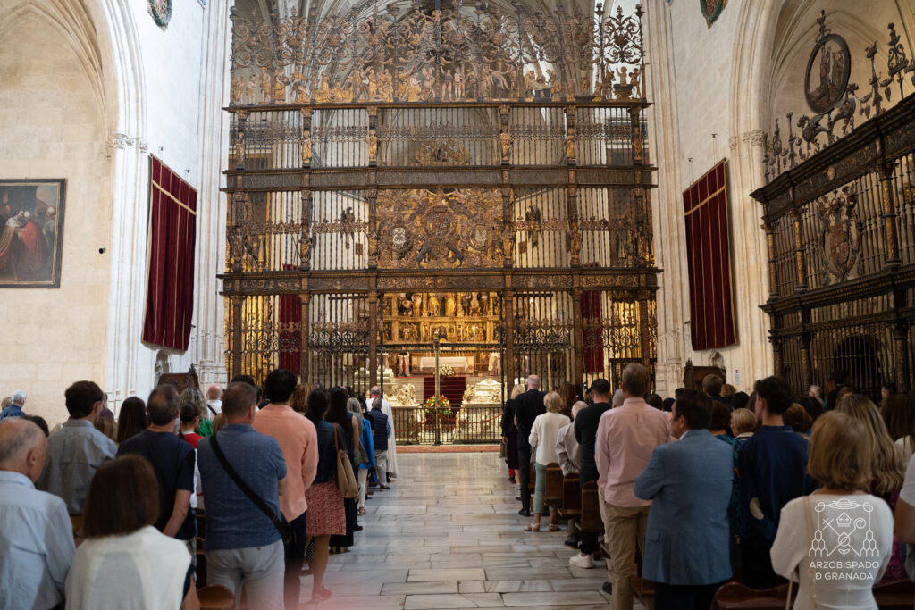 Granadinos de toda la provincia y fieles procedentes de Ávila, Valladolid y de los países de Hispanoamérica que se encuentran en nuestra ciudad han festejado juntos esta mañana la fiesta de la Hispanidad y del Día del Pilar, durante la Eucaristía celebrada en la Capilla Real, templo que custodia los restos de los Reyes Católicos en su cripta.