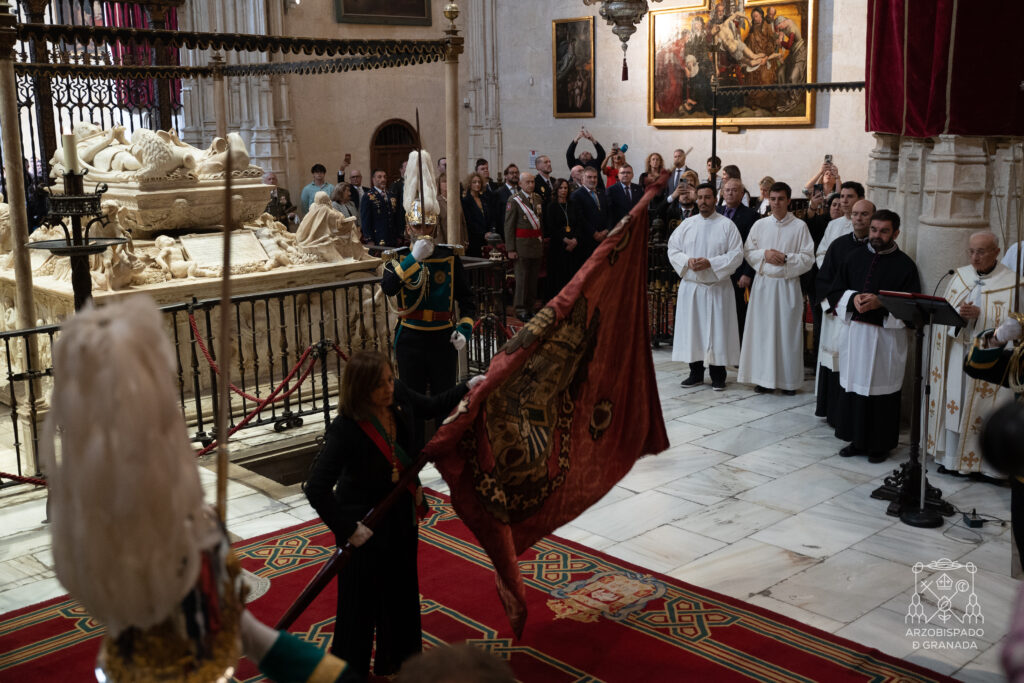 Ante el altar y la tumba del Reyes Católicos, la concejala Ana Belén Sánchez Requena fue la encargada de la tremolación del Estandarte de Castilla, que llegó encabezando la comitiva de la corporación municipal.