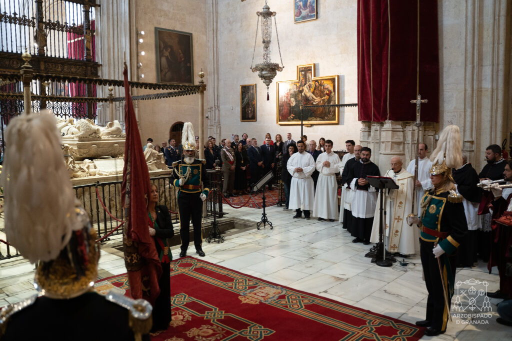 Tras la Santa Misa, la Capilla Real acogió el acto institucional con las autoridades del ayuntamiento, encabezados por su alcaldesa Marifrán Carazo, autoridades militares y miembros de la Diputación de Granada.