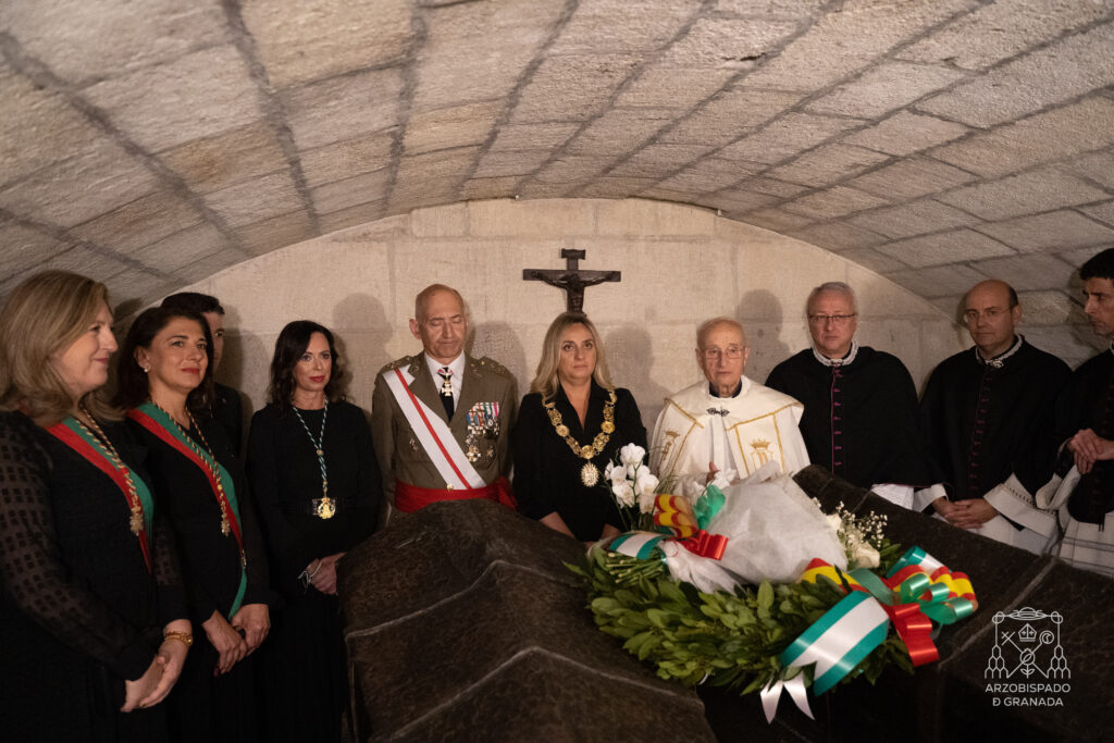 El acto concluyó con la ofrenda floral que el ayuntamiento, acompañados por el cabildo real, depositó sobre la tumba de los Reyes Católicos, que lograron la unidad de España y con ellos se evangelizaron los pueblos del Nuevo Mundo, creando desde entonces un vínculo a través de la fe cristiana y el idioma que festejamos especialmente este 12 de octubre.