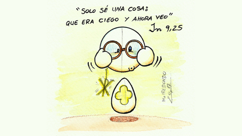Un relato más, a modo de catequesis bautismal, nos sitúa en un nuevo encuentro de Jesús, en este caso el escenario es Jerusalén, con un ciego de nacimiento, es decir, sin posibilidad de curación. Los discípulos se interesan por este personaje anónimo y le preguntan al Señor sobre el origen de la ceguera que padece, porque, según la tradición religiosa judía, las enfermedades y desgracias de la vida se asociaban al pecado, bien cometido por el individuo en cuestión o por sus progenitores. La respuesta de Jesús revienta esta concepción del pecado y al mismo tiempo se presenta así mismo como la luz del mundo que vence a la oscuridad.