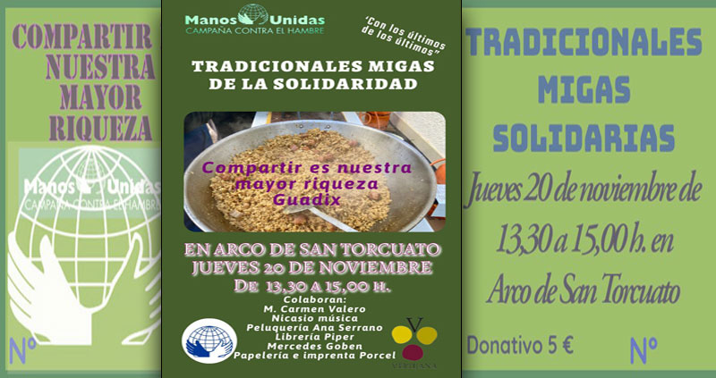 Un año más llegan las Migas Solidarias a la ciudad de Guadix, de la mano -nunca mejor dicho- de Manos Unidas. Serán el jueves 20 de noviembre, de 13´30h a 15´00 h, en el Arco de San Torcuato. Lo que se recoja servirá para financiar el proyecto de desarrollo que Manos Unidas de Guadix tiene comprometido este año que ya termina. Por eso son solidarias.