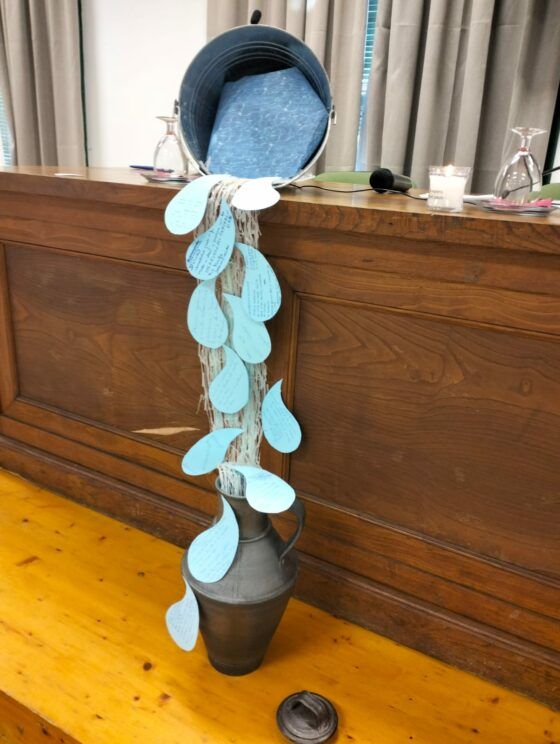El signo del “pozo”, presente en la ambientación, ayudó a expresar visualmente lo vivido. Desde un cántaro inclinado brotaba un chorro simbólico de agua formado por las “gotas” en las que cada grupo escribió los compromisos y resonancias surgidas del compartir fraterno. Así, lo escuchado en la intimidad se convertía en compromiso comunitario, un impulso misionero. Desde la escucha de la Palabra y la experiencia de comunión vivida, el laicado de Huelva es enviado a sus parroquias, movimientos, asociaciones y ambientes cotidianos para dar testimonio de una fe viva, reconciliada y esperanzada.