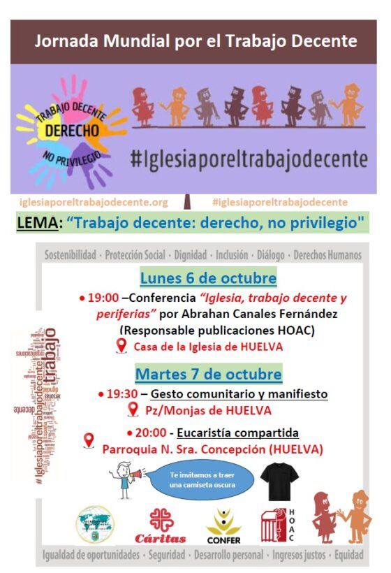 La entrada Jornada Mundial por el Trabajo Decente: “Trabajo decente, derecho, no privilegio” se publicó primero en Diócesis de Huelva.