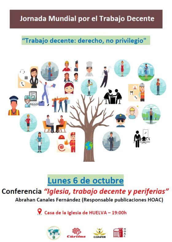 A las 19:00 h, en la Casa de la Iglesia de Huelva, se celebrará la conferencia “Iglesia, trabajo decente y periferias”, impartida por Abraham Canales Fernández, responsable de publicaciones de la HOAC (Hermandad Obrera de Acción Católica).