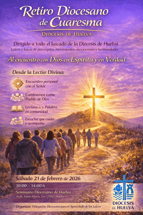La Delegación Diocesana para el Apostolado de los Laicos organiza el Retiro Diocesano de Cuaresma, que tendrá lugar el sábado 21 de febrero, de 10:00 a 14:00 horas, en el Seminario Diocesano de Huelva. Desde la Diócesis se anima a todo el laicado (de parroquias, movimientos, asociaciones, hermandades y demás realidades eclesiales) a participar en este encuentro de oración y renovación espiritual.
