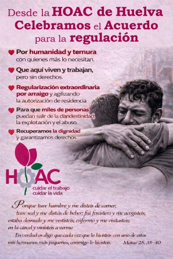 Desde la HOAC de Huelva se ha expresado públicamente la alegría por el acuerdo que permitirá avanzar en una regularización extraordinaria por arraigo, así como en la agilización de la autorización de residencia para miles de personas que, aun viviendo y trabajando en nuestro entorno, lo hacen sin derechos.