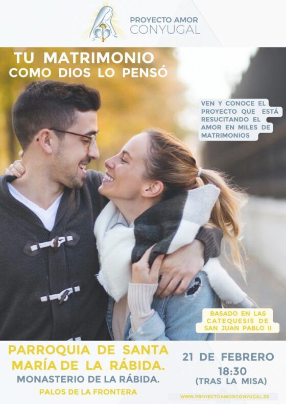 La Parroquia de Santa María de la Rábida, en Palos de la Frontera, acogerá el viernes 21 de febrero, a las 18:30 horas —tras la celebración de la Santa Misa—, una sesión informativa del Proyecto Amor Conyugal, una propuesta eclesial que está ayudando a revitalizar la vida matrimonial en numerosas diócesis.