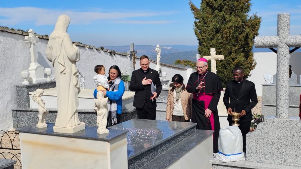 A continuación, el Obispo se trasladó al cementerio municipal, donde elevó una oración por el eterno descanso de los fieles difuntos de la localidad. En este momento de recogimiento y esperanza cristiana, varios fieles acompañaron al Obispo, recordando especialmente a sus familiares fallecidos y a los sacerdotes, hijos del pueblo, allí enterrados.
