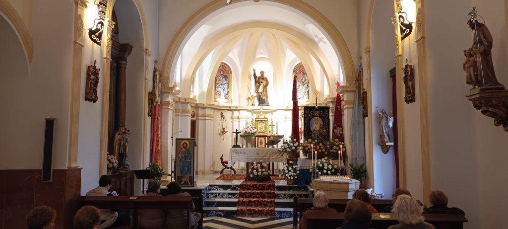 El altar, preparado para entronizar a la Patrona de la Diócesis, se engalanó con el estandarte de nuestra Patrona, la Virgen de los Dolores, y con las banderas de San Pedro ad Víncula y de la Virgen de Alharilla, grandes devociones del pueblo escañolero.