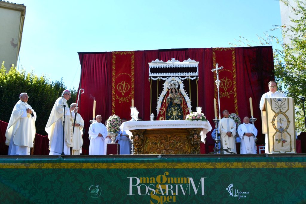 La Virgen del Rosario, de la Hermandad de la Amargura, de Jaén, iluminaba con su presencia el altar efímero, preciosamente adornado. El Evangelio fue proclamado por el diácono permanente, D. Manuel Rico. Y el acompañamiento musical corrió a cargo del Coro de la Santa Cena de Jaén.