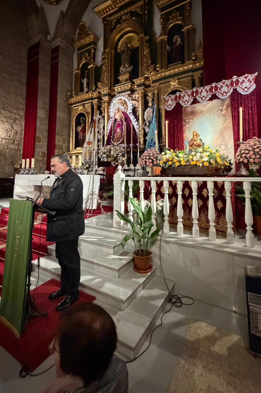 En un momento de tregua de la lluvia, la imagen llegó a la Parroquia de La Natividad de Nuestra Señora a las 11:40 de la mañana, recibida entre aplausos, vivas y el tañer de las campanas por el párroco D. Pedro José Martínez Robles, por Junta de Gobierno de la Cofradía de la Virgen de la Cabeza de Jamilena, los Hermanos Mayores, las anderas, un gran número de cofrades y fieles congregados todos a las puertas de la iglesia. Tras ser colocada en el altar efímero realizado para esta visita, comenzaron la oración de bienvenida y los actos organizados por la Cofradía, con su presidente siempre al frente, D. Pedro José Checa Garrido. La comunidad se unió en el rezo del Ángelus y del Santo Rosario por todos los difuntos de Jamilena, llenando el templo de recogimiento y gratitud.