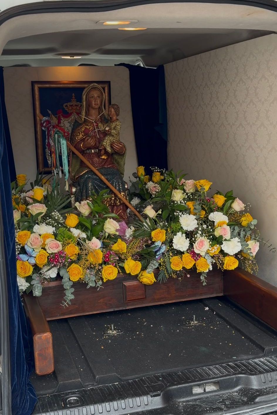 Al finalizar la Santa Misa, estaba previsto una sencilla procesión por las calles cercanas a la parroquia con la imagen Peregrina de la Virgen, pero la lluvia no permitió que se pudiera realizar, por lo que las anderas de la Virgen la cogieron en el interior del templo. Fue un hermoso y emocionante momento que estuvo acompañado por la Banda de Música “Miguel Ángel Colmenero”.