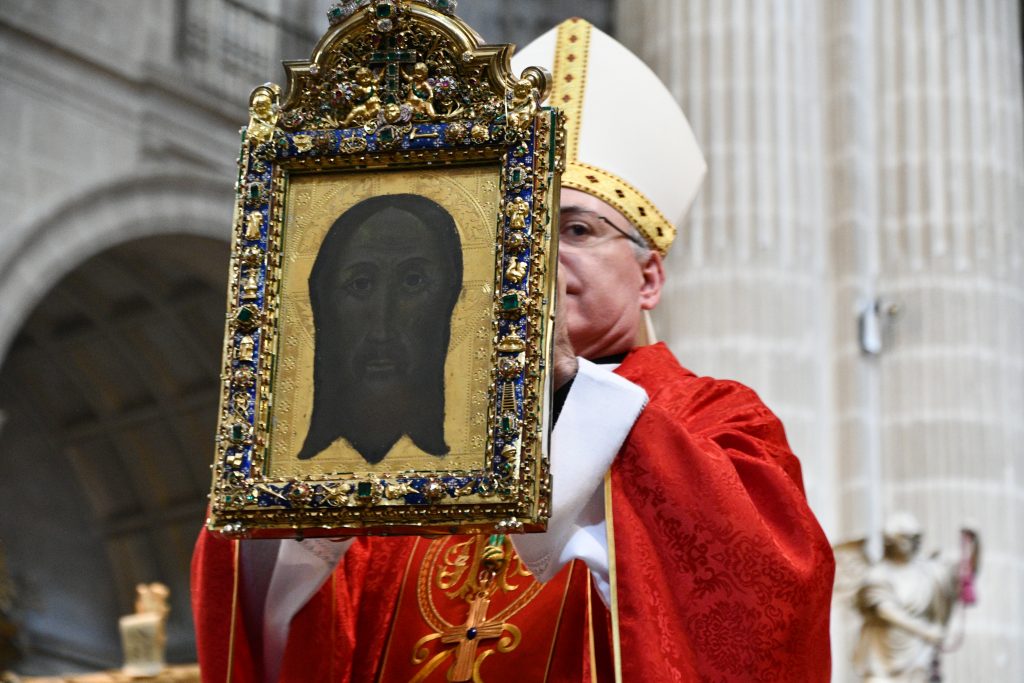 Al finalizar la Comunión, y como parte de la celebración jubilar, D. Ildefonso Rueda llevó hasta el presbiterio el Santo Rostro, ante el que se pidió por las intenciones del Santo Padre. Posteriormente, el Pastor diocesano impartía, con esta reliquia, la bendición solemne.